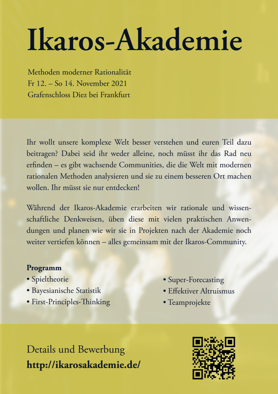 Liebe GI-Gruppe, Die Ikarus-Akademie ist ein Wochenendseminar für moderne rationale Methoden, veranstaltet von mir (einem Physiker) und Maximilian (einem Spieltheoretiker). Konkret werden wir viel Spieltheorie, Bayesianische Statistik, Cognitive Biases und Forecasting-Methoden behandeln. Denkt ihr, dass einige eurer Mitglieder daran interessiert sind, besser zu lernen ihr analytisches Denken auf die Alltagswelt anzuwenden und gleichzeitig Gleichgesinnte kennen lernen wollen? Dann leitet unsere Webseite gerne an sie weiter. https://ikarosakademie.de/ <https://ikarosakademie.de/> Ganz Liebe Grüße Yannik Zimmermann